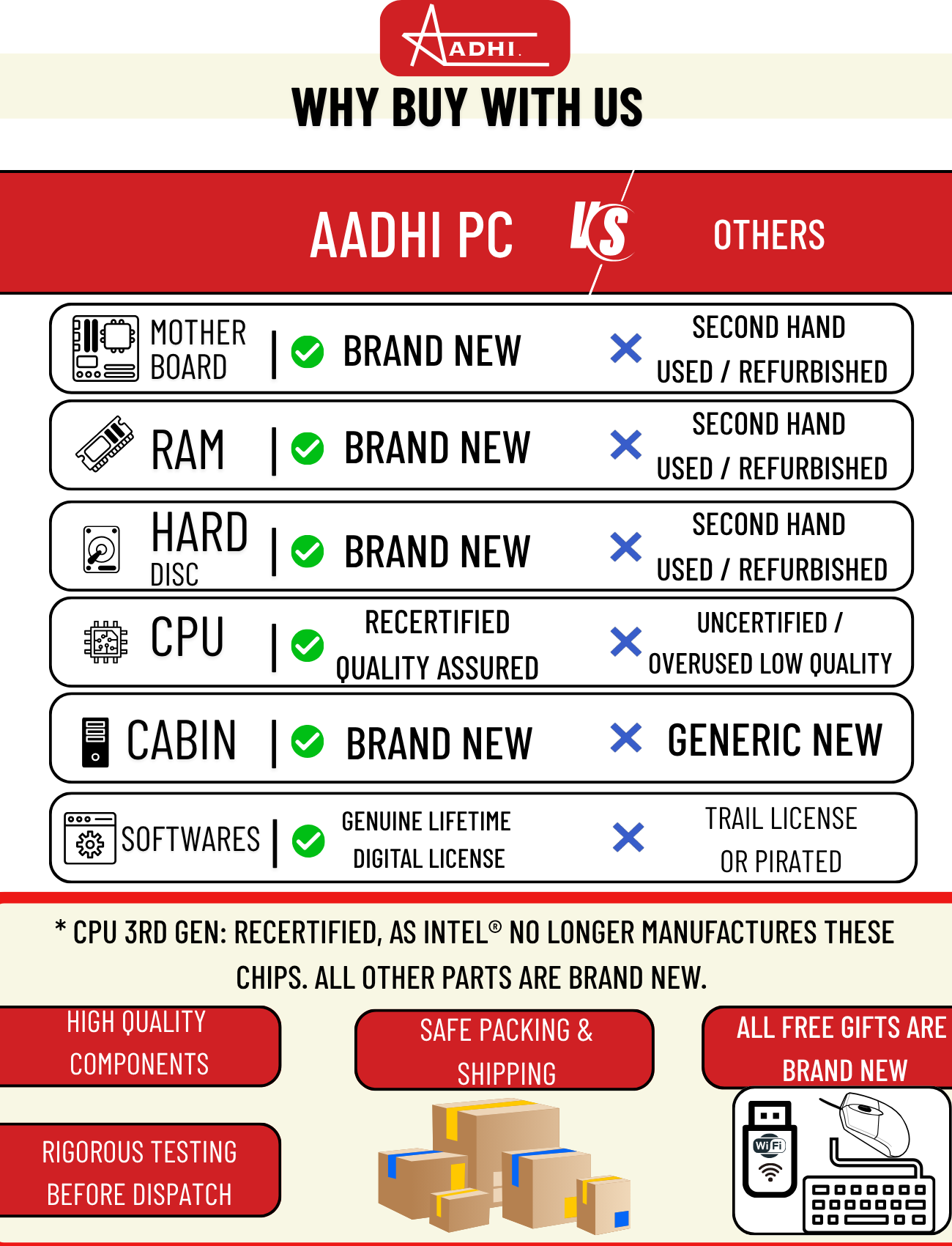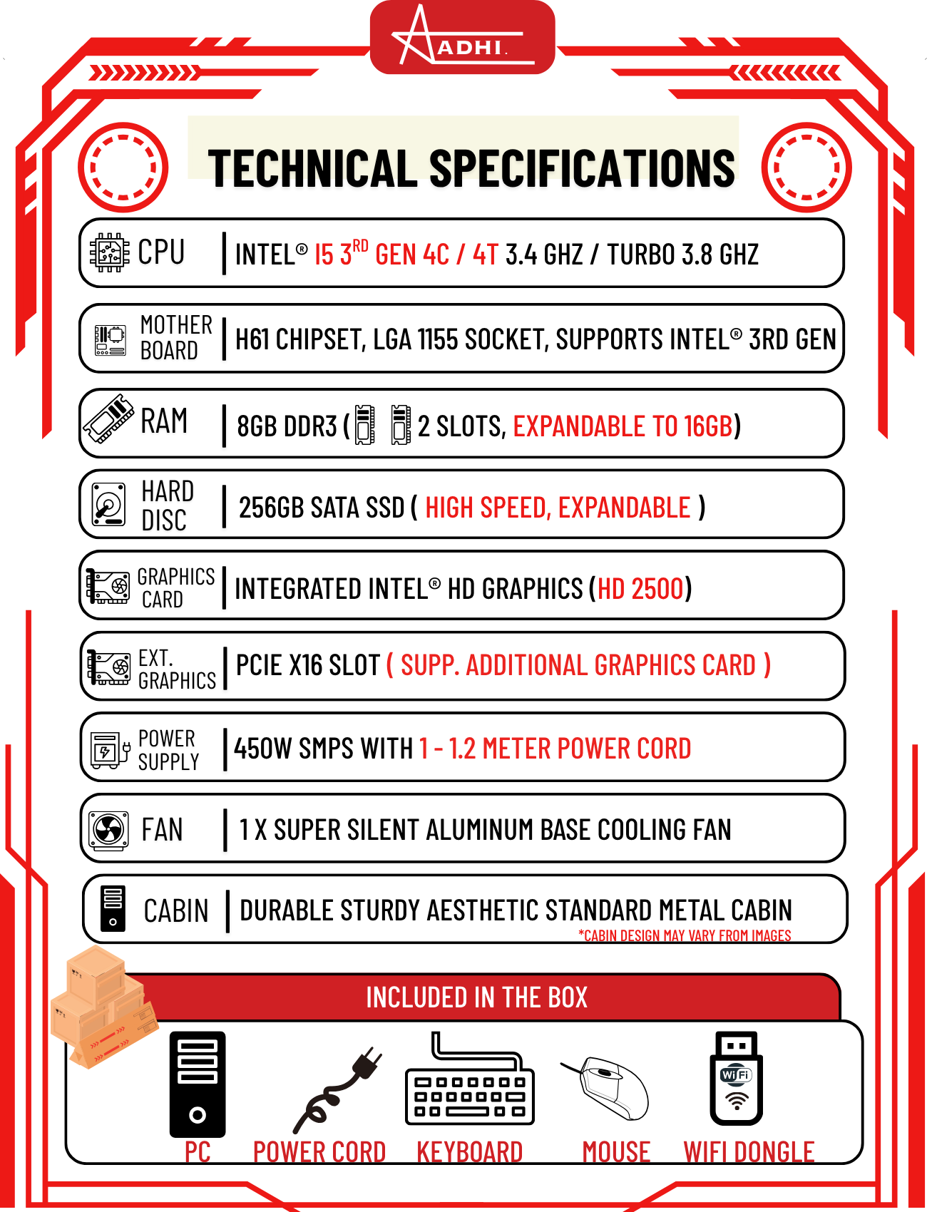 This AadhiPC Business Lite Desktop - perfect for office work, home use, personal tasks, and students. Powered by an Intel® i5 3rd Gen processor, 8GB RAM, and a 256GB SATA SSD, it handles everyday tasks smoothly — from attending online classes and video calls to browsing, managing documents, and streaming videos.